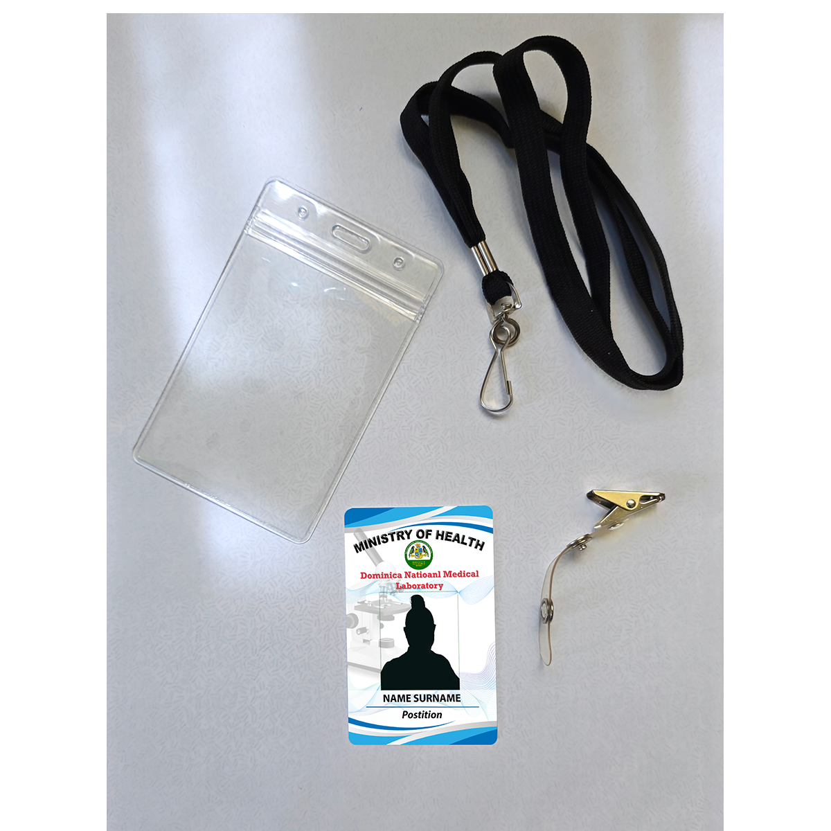 Basic ID Card with Lanyard and/or clip and a flexible clear plastic pouch. All cards are designed and printed by FabiMed Services Accessories +. We ensure the highest quality of ink-printed PVC cards.