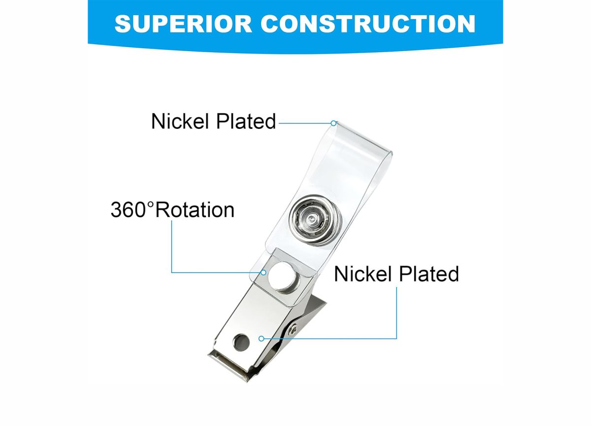 Fasten to clothing, bags and more to leave hands free, Metal clip with 2 prepunched holes ,Clear PVC strap, easy to open and close Clip adapter hold security, ID and proximity cards.